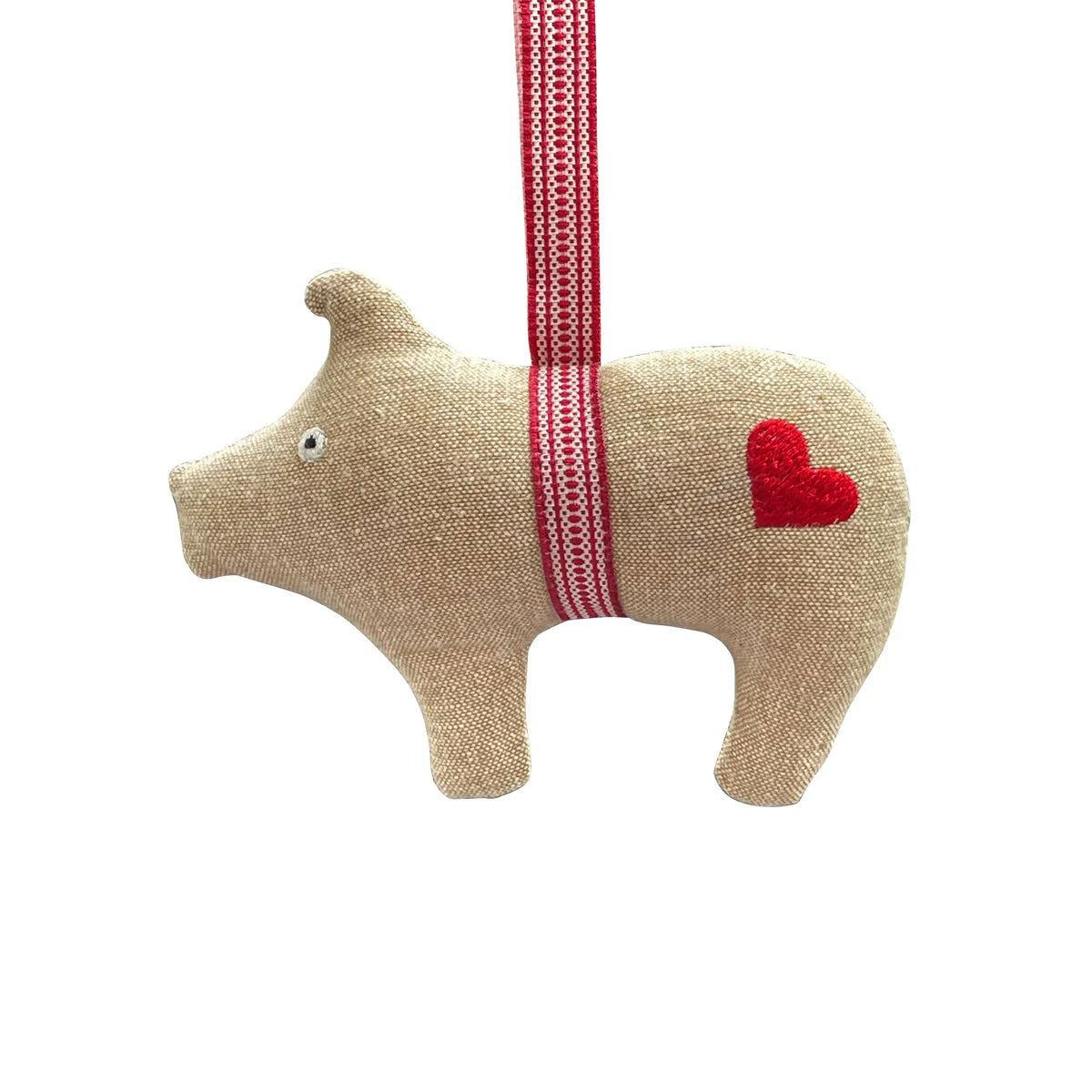 Das Ferkel aus Chambray Stoff mit rot/weißem Band zum Aufhängen ist sehr ansprechend und der perfekte nordische Hingucker in jedem Weihnachtsbaum.