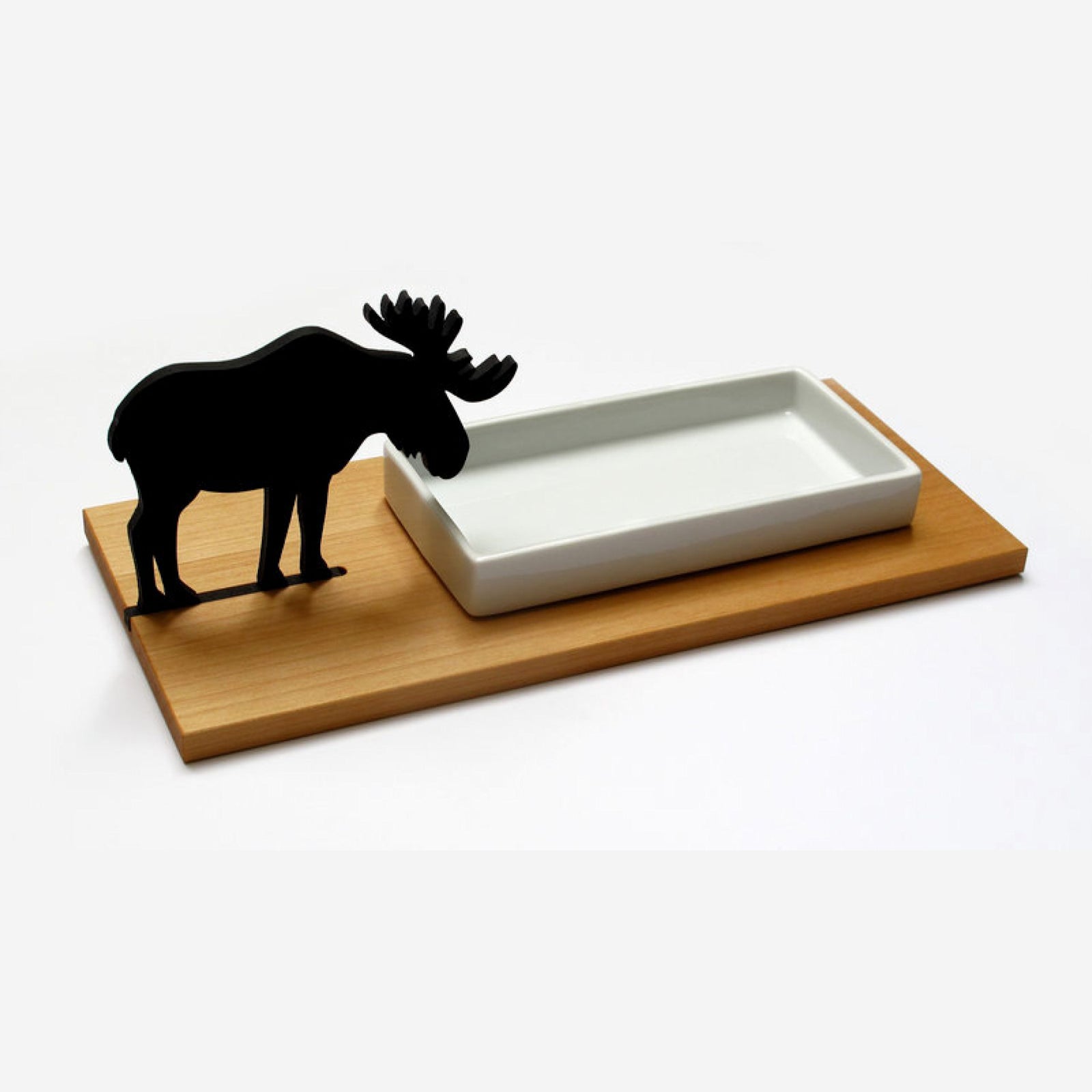 Im Brettchen befindet sich eine Nut, indem die Elch-Silhouette eingesteckt wird. Zudem befindet sich eine Vertiefung unter der Porzellanschale im Brettchen. Das verhindert, dass die Porzellanschale das Brettchen ungewollt verlässt.